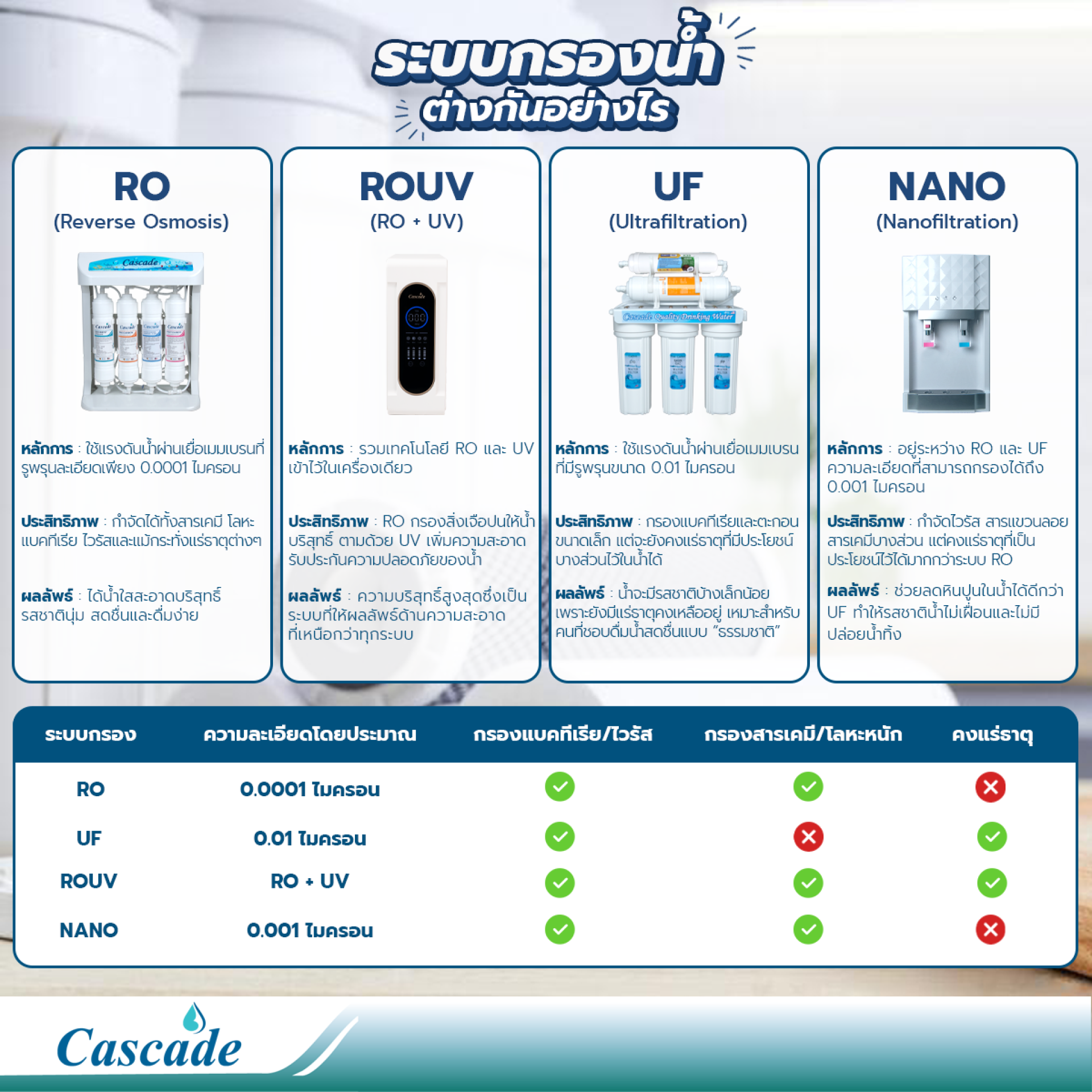 ดังนั้นแล้วหากต้องการน้ำสะอาดและบริสุทธิ์ที่สุด ควรเลือก RO หรือ ROUV แต่หากต้องการน้ำที่สะอาดและยังมีแร่ธาตุอยู่ ควรเลือก UF
